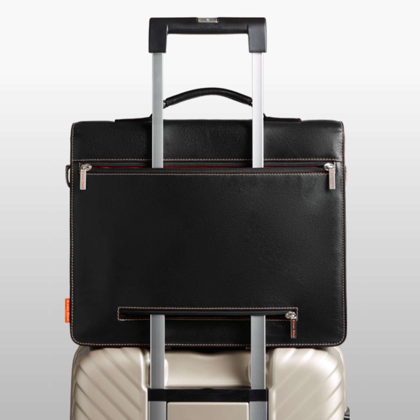 The Amsterdam briefcase features a dual-zip luggage sleeve, allowing you to effortlessly secure it to your trolley