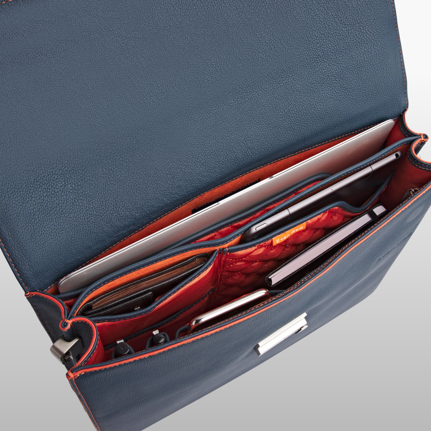 The Amsterdam Briefcase fits a MacBook 13" / 14", iPad, notepad, and daily essentials with 13 smart interior pockets. Larger laptops (up to 15.6") fit in the main compartment, but not the padded section. Includes a removable 3cm (1.18") wide strap.